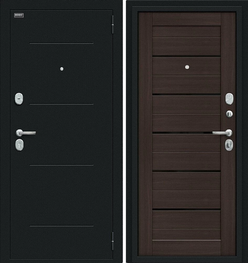 Надежная входная Браво Техно Kale Букле черное/Wenge Veralinga премиум класса по цене 35 110 руб. Большая толщина стали защитит от проникновения в ваш дом, квартиру или коттедж. Используется очень качественная фурнитура: замки, цилиндры, ручки, защелки. Покрытие и отделка двери изготовлено под внимательным контролем производителя. Дверь имеет долгий срок службы и гарантию.