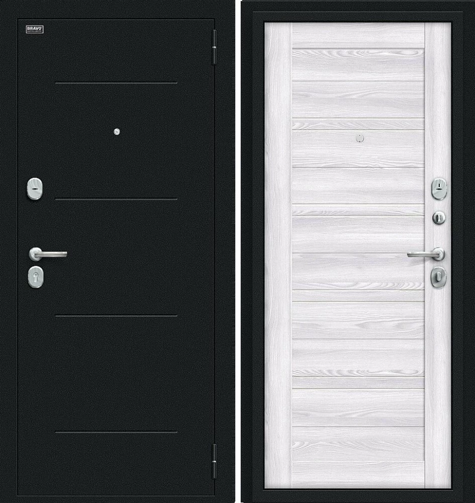 Надежная входная Дверь Браво Сити Kale Букле черное/Riviera Ice премиум класса по цене 36 360 руб. Большая толщина стали защитит от проникновения в ваш дом, квартиру или коттедж. Используется очень качественная фурнитура: замки, цилиндры, ручки, защелки. Покрытие и отделка двери изготовлено под внимательным контролем производителя. Дверь имеет долгий срок службы и гарантию.